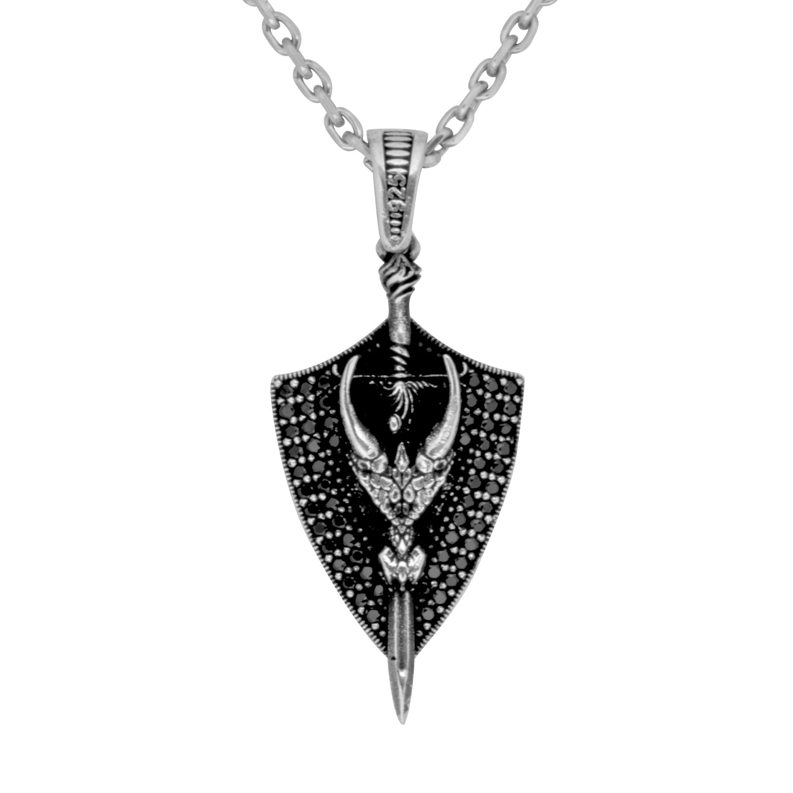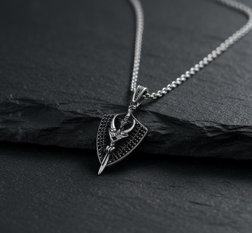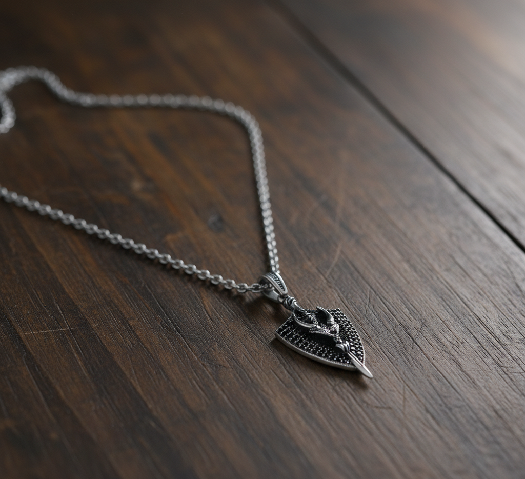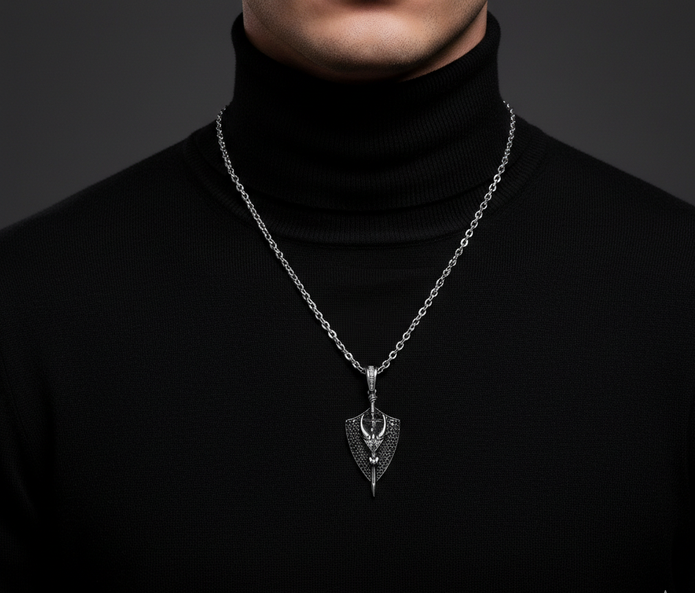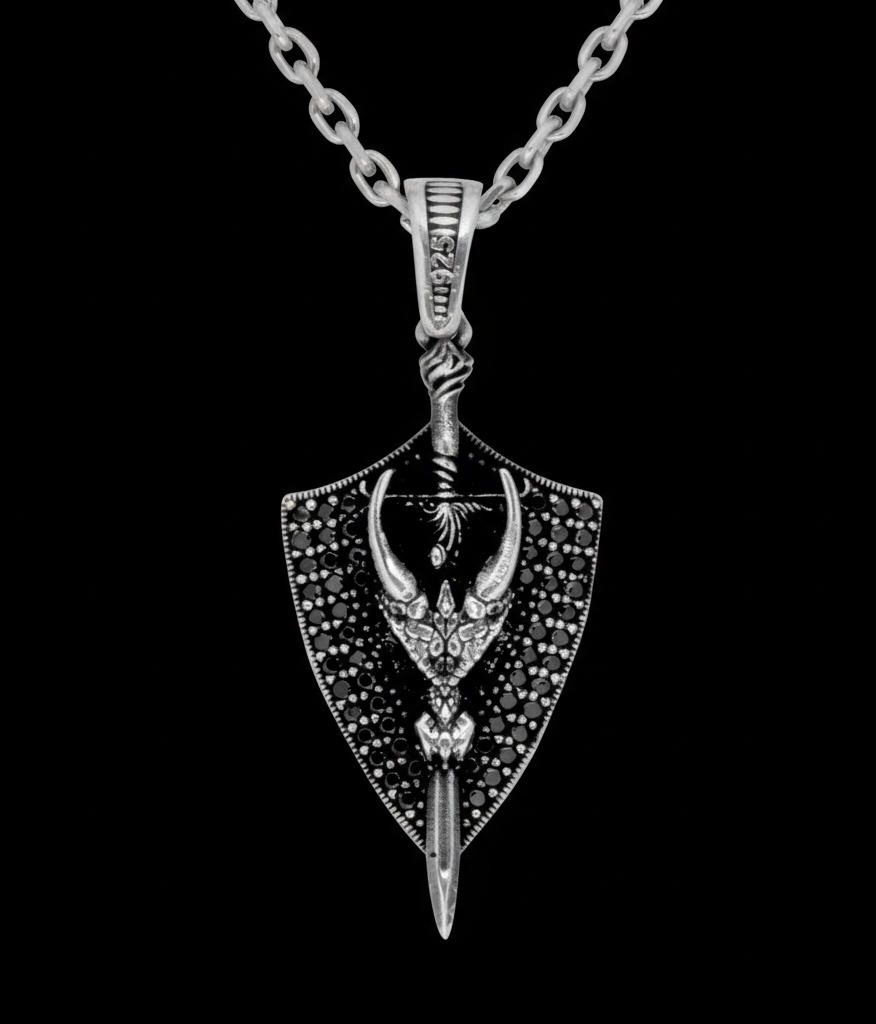 • Este colgante de plata es un emblema de defensa personal y valentía. El escudo representa seguridad y resistencia, mientras que la espada atraviesa el centro como signo de acción y liderazgo. Un accesorio para quienes buscan expresar su espíritu guerrero con estilo. 🛡️⚔️.