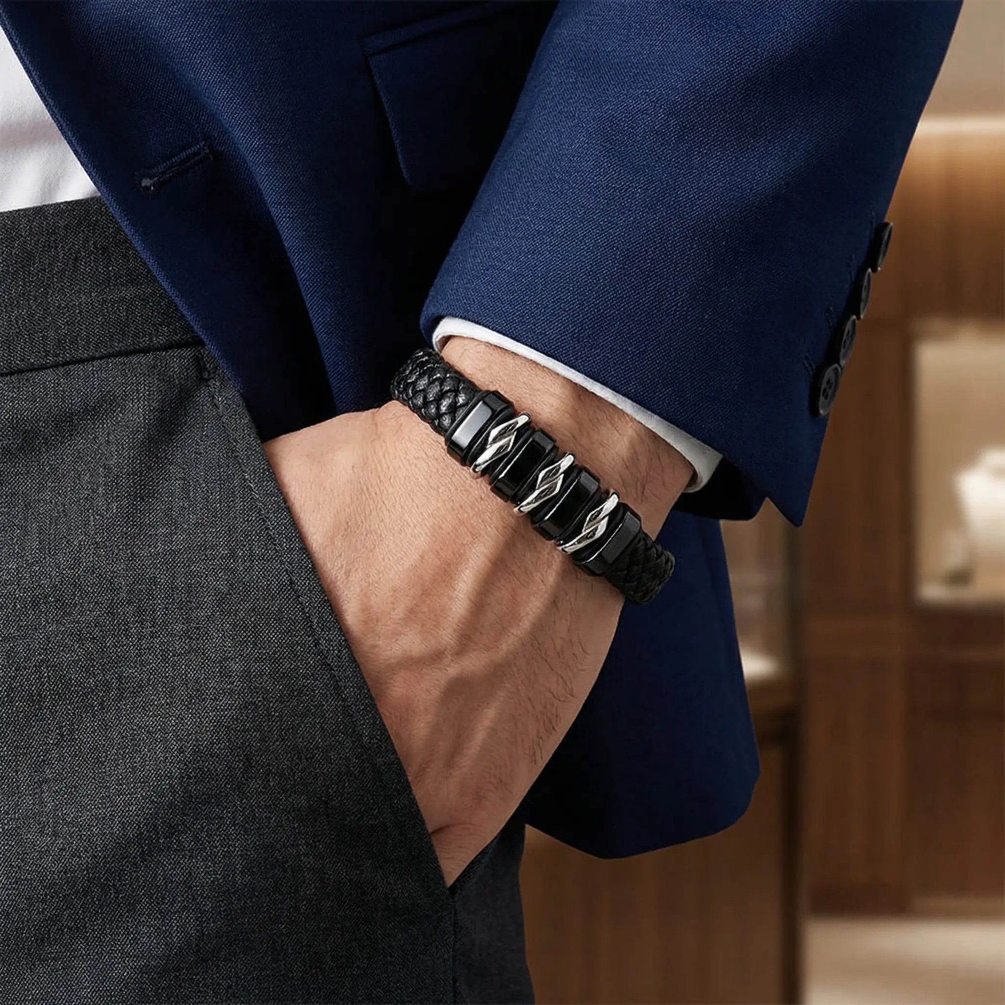 - “Pulsera de cuero trenzado y acero que representa poder, estilo y seguridad en cada detalle.”